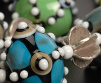 The beads are then incorporated into unique jewelry designs also created by the artist. Additional materials, such as semi precious stones, pearls and Thai silver are combined with the glass beads to create a dialogue between color, pattern, texture and materials. The elegant designs often refer to the artist’s interest in art history, gardening, nature and the universe.