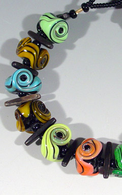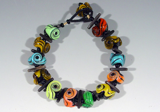 , bracelet with lampworked glass beads, bone and seed beads. $130.00